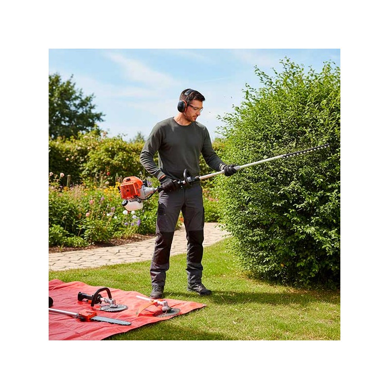 La versatilità è il cuore di questa straordinaria attrezzatura. Grazie ai suoi 8 accessori, tra cui un decespugliatore, un tagliasiepi e una motosega, potrai affrontare qualsiasi tipo di lavoro in giardino. La lama in acciaio temprato da 560 mm e l'angolo di taglio regolabile a 135 gradi ti permettono di personalizzare ogni taglio con precisione. Non dovrai più preoccuparti di attrezzi diversi e ingombranti: tutto ciò di cui hai bisogno è qui, in un unico strumento elegante e potente. E con un consumo di carburante inferiore a 0,7 l/h, risparmi anche sui costi di gestione!