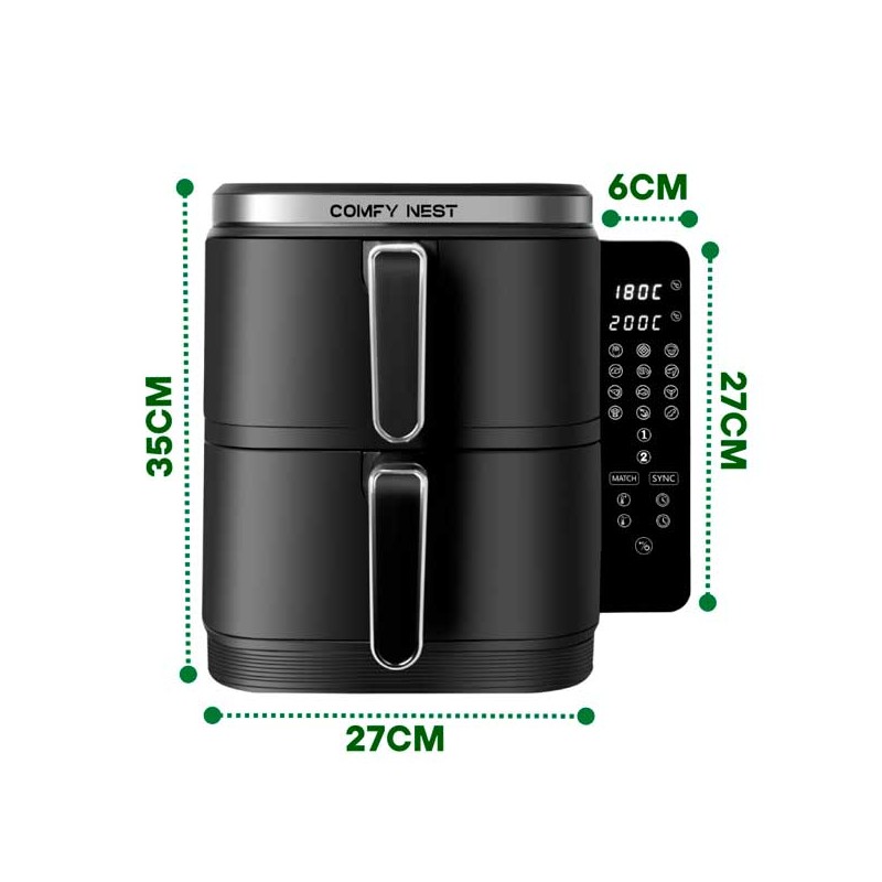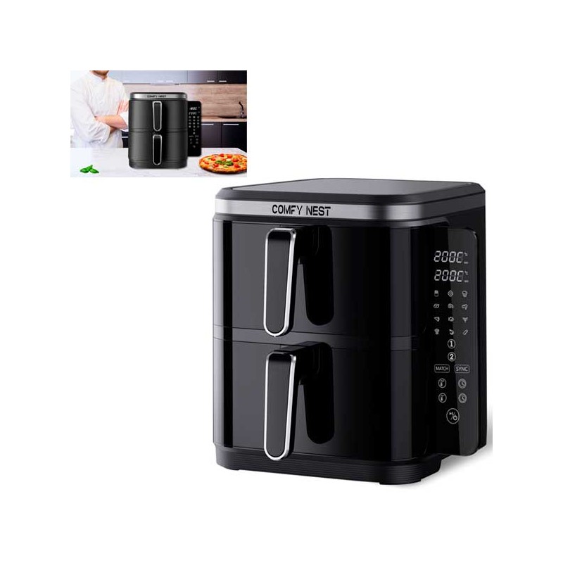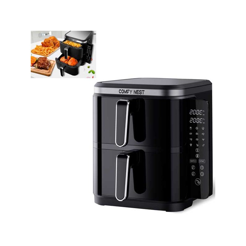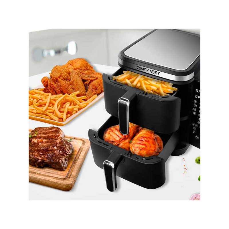 Sei stanco di passare ore in cucina, cercando di preparare piatti deliziosi per la tua famiglia o i tuoi amici? Con la Friggitrice ad aria doppia 11 L, il tuo problema è risolto! Questo straordinario elettrodomestico non solo ti permette di cucinare due piatti diversi contemporaneamente grazie al suo design innovativo a doppia cesta, ma lo fa anche in modo rapido e sano. Dimentica le lunghe attese e i piatti freddi: con la tecnologia avanzata Rapid Air, otterrai cibi croccanti e saporiti con pochissimo olio, mantenendo intatti gusto e consistenza. È il momento di dire addio alle friggitrice tradizionali e abbracciare un modo di cucinare più intelligente e salutare!