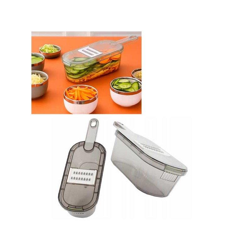 Il design intelligente del CORTATORE MULTIFUNZIONE include un pratico recipiente trasparente che non solo mantiene l'ordine mentre lavori, ma ti consente anche di controllare facilmente la quantità e la qualità dei tuoi ingredienti. Dimentica i colatori separati: il colino integrato nel contenitore ti permette di scolare frutta e verdura in un attimo, rendendo la preparazione delle insalate e dei piatti freschi un gioco da ragazzi. Ogni dettaglio è pensato per offrirti la massima comodità e sicurezza, come il supporto per le verdure che ti protegge mentre affetti anche i prodotti più piccoli. Il tuo tempo in cucina diventa più piacevole e meno stressante!